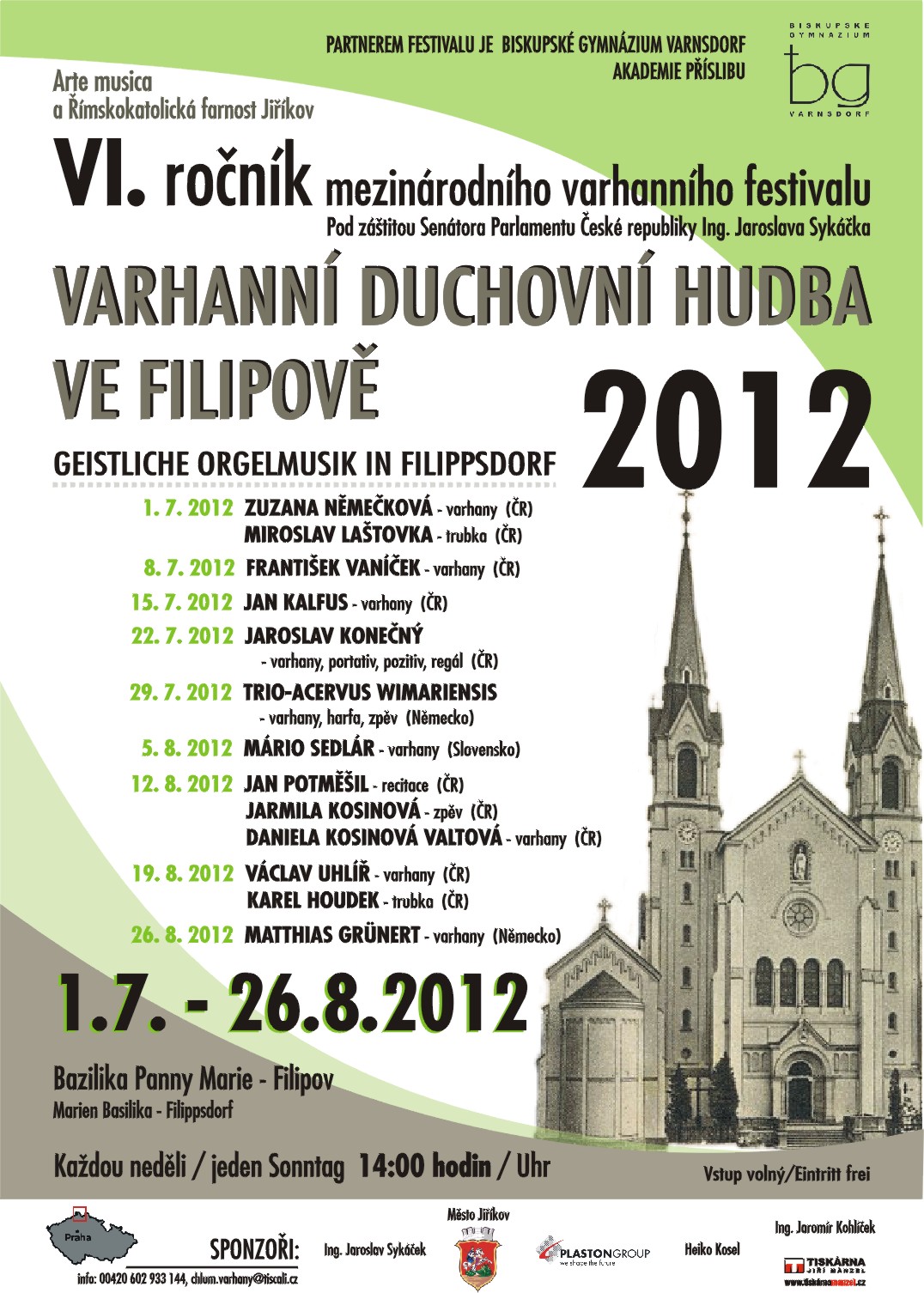 Šestý ročník mezinárodního festivalu Varhanní duchovní hudba ve Filipově 2012 bude probíhat každou neděli od 14.00 hodin od července do srpna ve filipovské bazilice minor Panny Marie Pomocnice křesťanů.