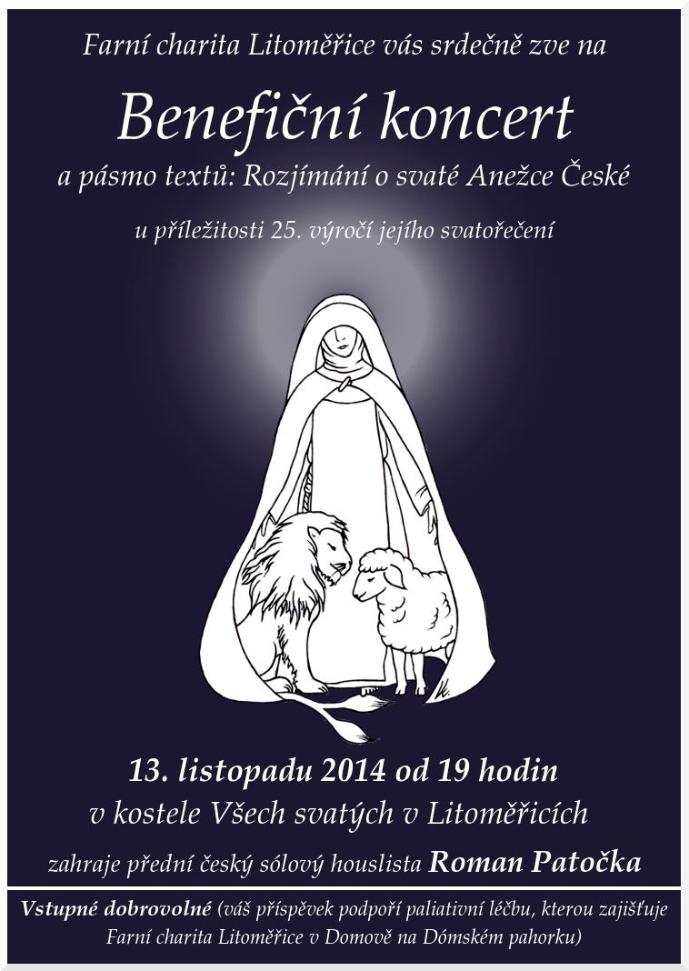 - Litoměřice, kostel Všech svatých, 19.00 hodin - benefiční koncert a duchovní pásmo Rozjímání o sv. Anežce České. Společná modlitba večerních chval začíná ve 21.05 hodin, nešpory bude živě přenášet Radio Proglas. Pro účastníky budou k dispozici vytištěné texty. Zveme všechny, aby se zapojili, a to i ti, kteří s modlitbou breviáře nemají zkušenost. Předběžná zkouška proběhne po skončení houslového benefičního konertu Romana Patočky a rozloučení s ním, přibližně ve 20.45 hodin.