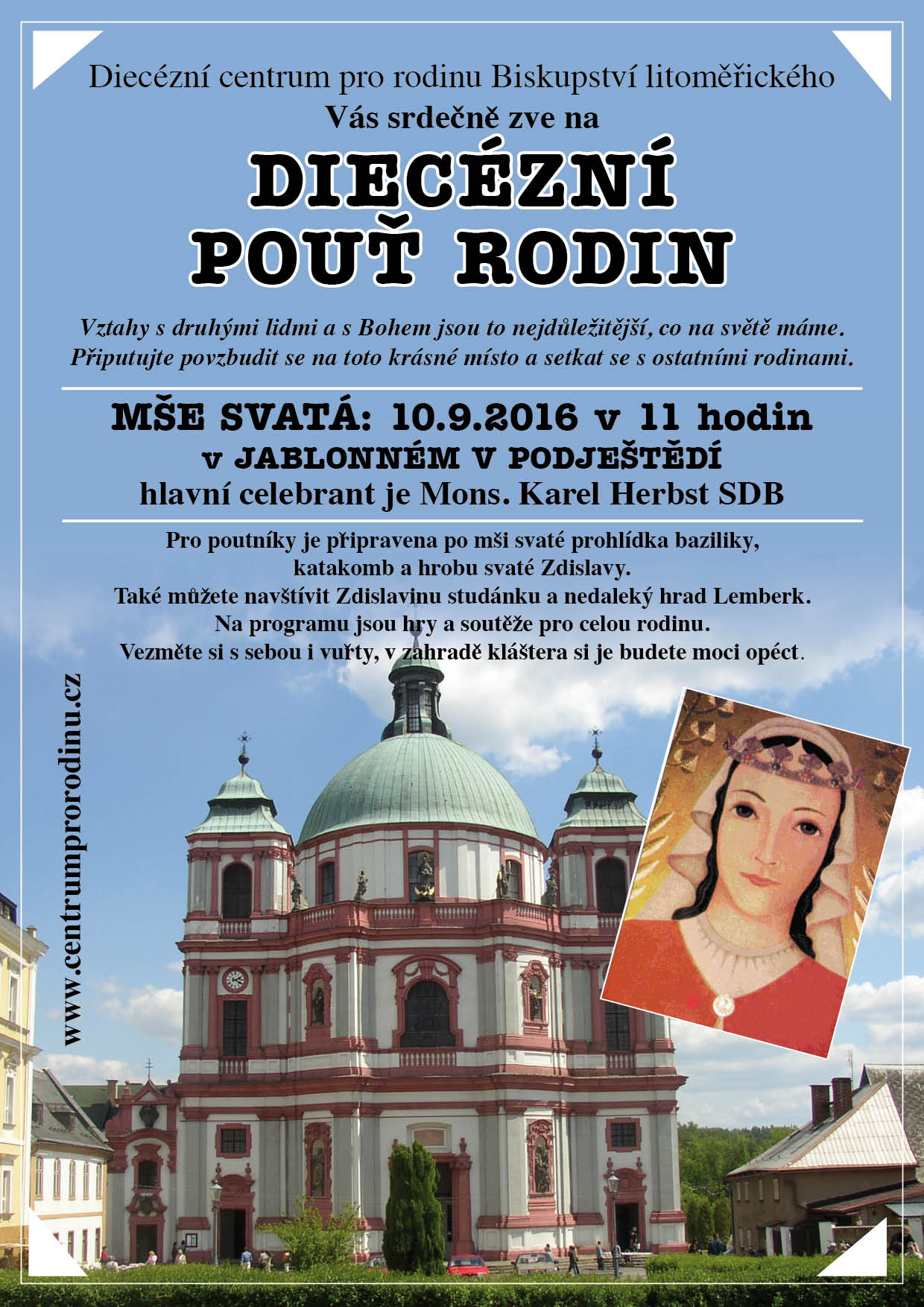 Pozvánka na diecézní pouť rodinCentrum pro rodinu vás zve na diecézní pouť rodin ke sv. Zdislavě do Jablonného v Podještědí, která se bude konat 10. září 2016.