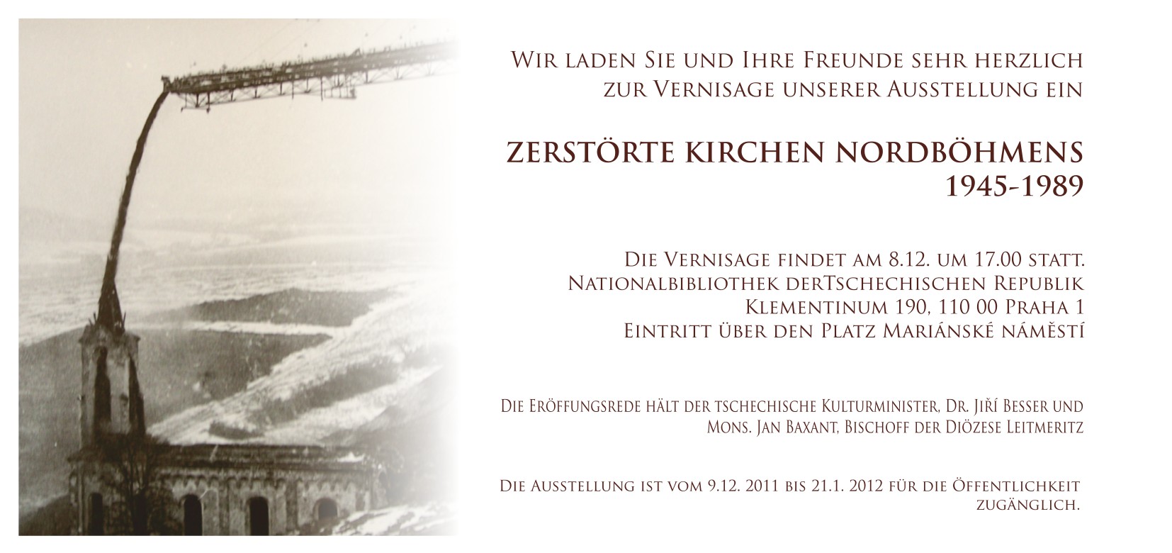 Ve čtvrtek 8. prosince 2011 od 17 hodin se v pražském Klementinu uskuteční vernisáž výstavy Zničené kostely severních Čech 1945–1989. Úvodní slovo při otevření výstavy pronese litoměřický biskup Jan Baxant a ministr kultury ČR Jiří Besser.
