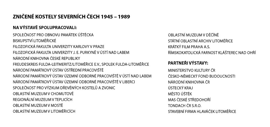 Cílem výstavy je připomenout široké veřejnosti demolice kostelů v severních Čechách pomocí jakési sondy po „typických případech demolic - jedná se zejména o souvislosti s tzv. zakázanými prostory (vojenský výcvikový prostor Ralsko, hraniční pásmo), masivní povrchovou těžbou hnědého uhlí, stavbou vodních přehrad Nechranice a Přísečnice či téměř plošnou demolicí kostelů v okolí Verneřic na Děčínsku. Výstava je tvořena informačními panely v česko-německé jazykové mutaci s bohatým obrazovým doprovodem. Chomutovské muzeum ji pak, mj. ve spolupráci s Biskupstvím litoměřickým, doplnilo sochami a inventářem ze zničených kostelů. K výstavě, která je výsledkem společného projektu, na němž se vedle Společnosti pro obnovu památek Úštěcka či litoměřického biskupství podílí množství různých institucí včetně univerzit a památkových ústavů, byl rovněž vydán i katalog, který si můžete zakoupit na výstavě či na recepci litoměřické biskupské kurie.