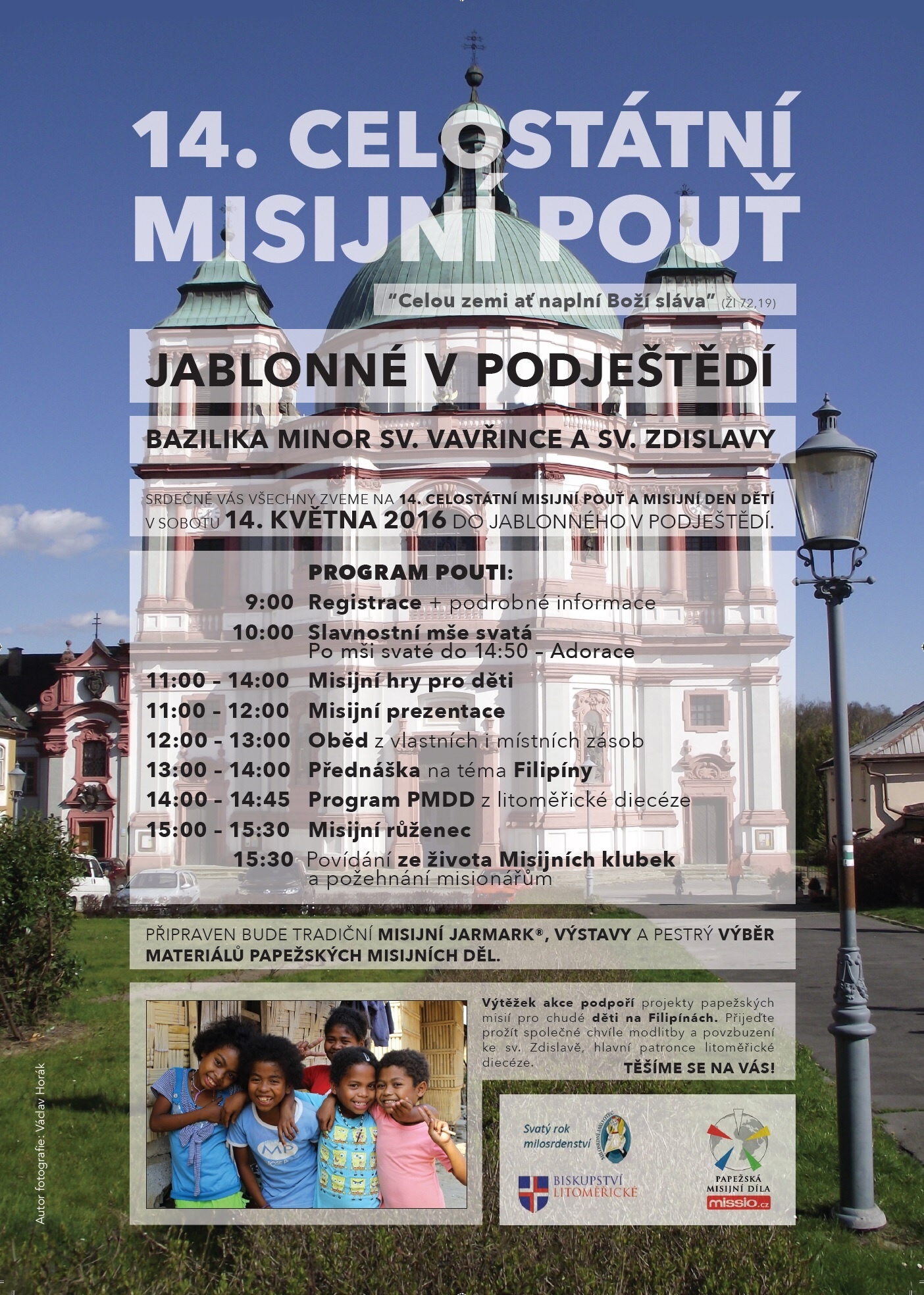 Papežská misijní díla v České republice představí svoje aktivity 14. května na celostátní misijní pouti v Jablonném v Podještědí. Výtěžek z akce pomůže zajistit jídlo, lékařskou péči nebo školní pomůcky pro chudé děti na Filipínách.